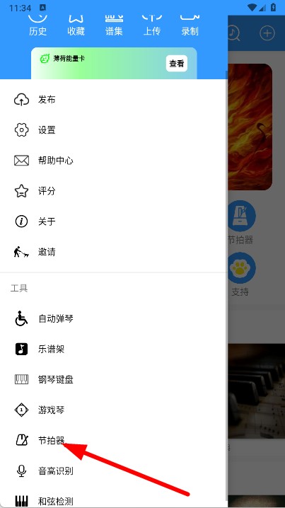 2、在功能菜单中,点击节拍器选项,进入节拍器设置页面。