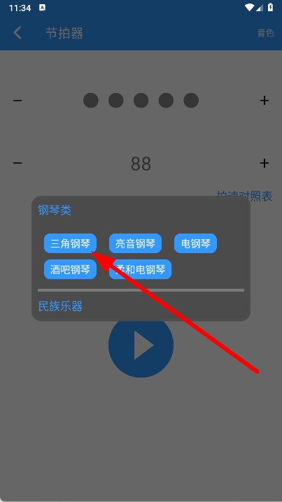 4、音色设置好后,点击页面中间的播放按钮,启动节拍器,即可辅助钢琴弹奏练习。