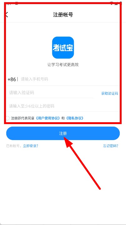 4、依次输入手机号码、验证码,设置至少6位的密码,点击注册按钮,完成账号注册。