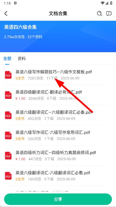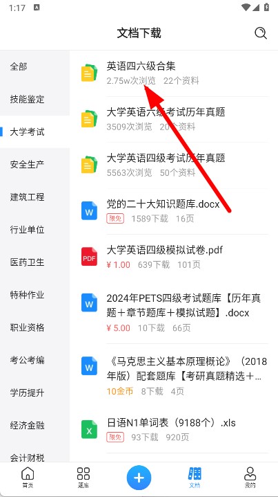 2、在文档下载页面,点击英语四六级合集,进入文档合集列表。