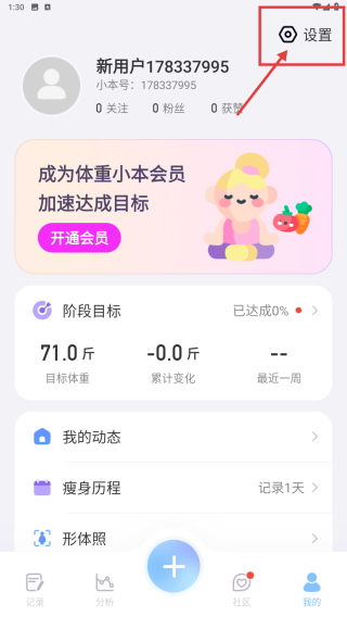 2、设置超重提醒:进入设置界面,找到体重目标相关选项,输入理想的目标体重,开启超重提醒功能,后续体重超标时将收到软件推送的提醒通知。