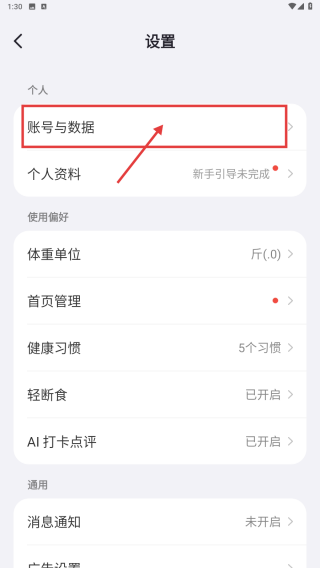 3、在设置界面,点击账号与数据选项,进入账号与数据页面。