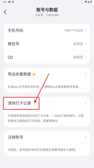 4、在账号与数据页面,点击清除打卡记录选项,可清除所有历史打卡记录操作不可逆,需谨慎。