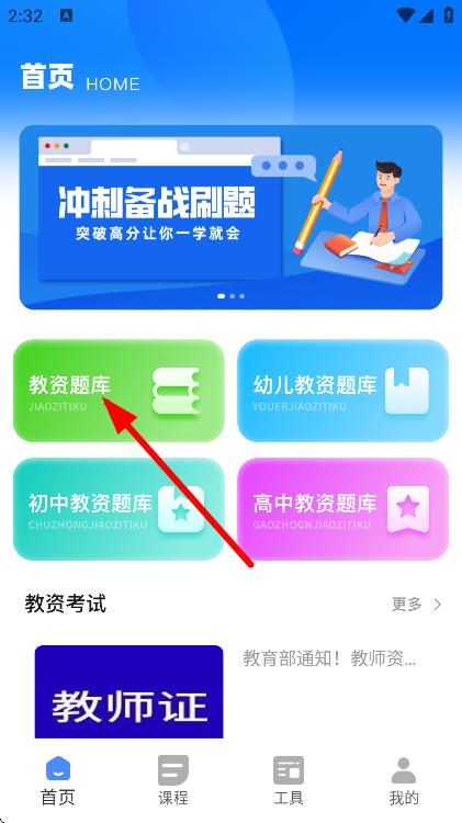 1、在首页,点击教资题库,进入教师资格证相关页面。