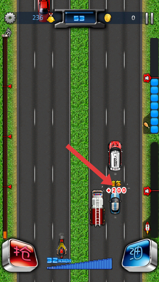 2、轿车阻挡路线时,瞄准目标车辆点击已装备的武器如虚拟炮弹,击中后可清除障碍并触发撞车+200的得分提示。