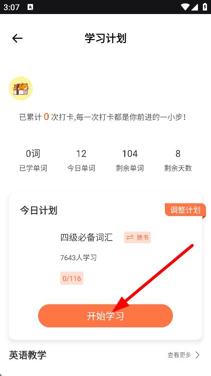 2、在学习计划页面,点击开始学习,进入词汇学习页面。