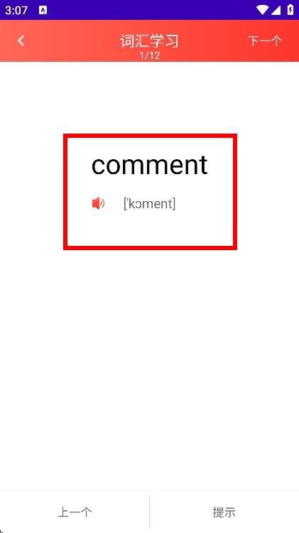3、在词汇学习页面,可学习单词,如comment,能查看音标等。
