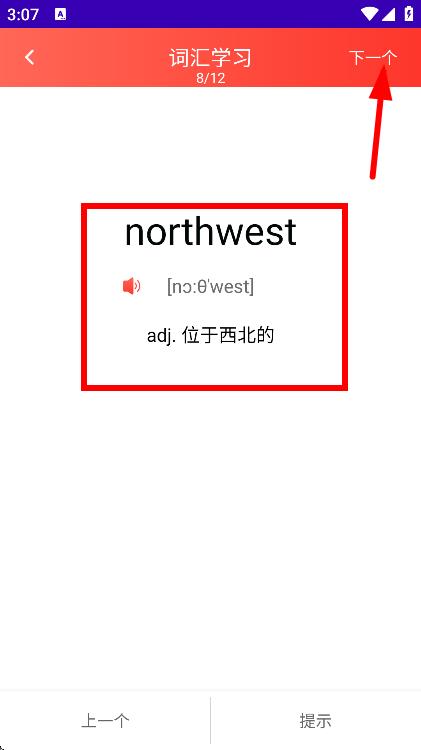 4、学习完当前单词,点击下一个,可继续学习下一个单词。