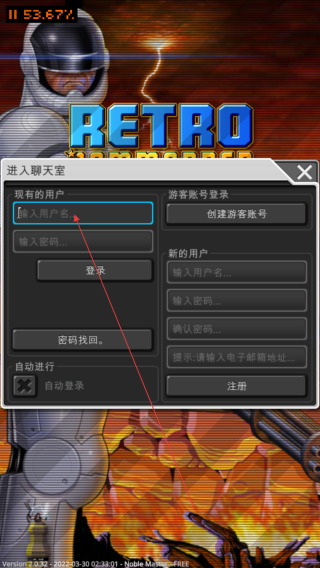 1、在登录界面输入用户名,若不想注册,也可点击创建游客账号快速进入游戏,若忘记密码,点击密码找回按提示操作。