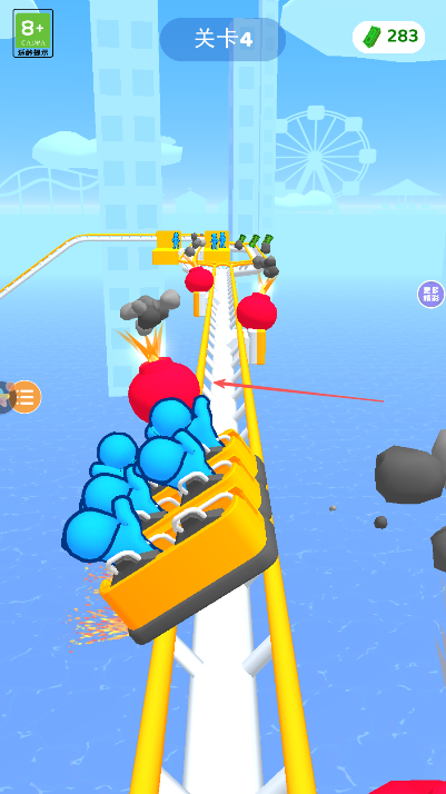 3、关卡4遇到红色炸弹障碍物操控过山车躲避防止减少乘客或失败。