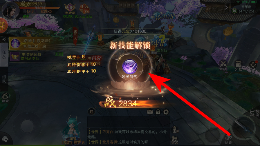 3、接着解锁技能,推进过程中,达到一定条件会解锁新技能,像冲灵剑气等,这些新技能能丰富战斗手段,提升角色战力。