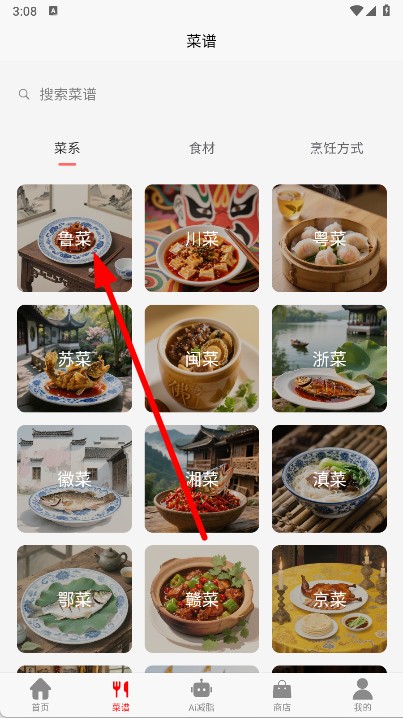 1、打开元灵厨坊,进入菜谱页面,在菜系分类中点击鲁菜。