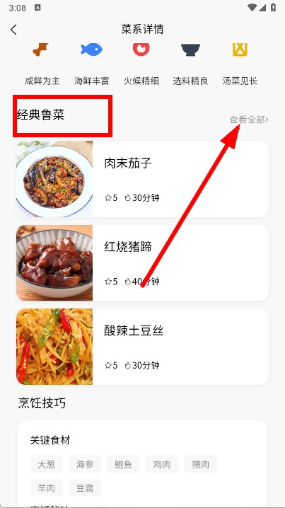 2、进入鲁菜菜系详情页后,找到经典鲁菜板块,点击右侧查看全部。