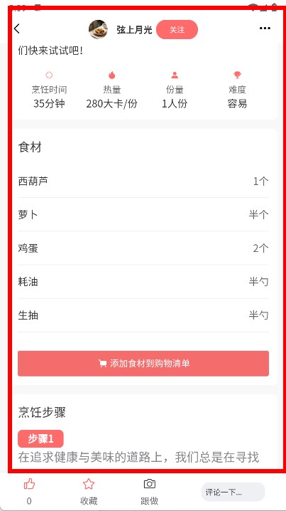 4查看该菜品的烹饪时间、热量、份量、难度等信息,以及食材清单和烹饪步骤。