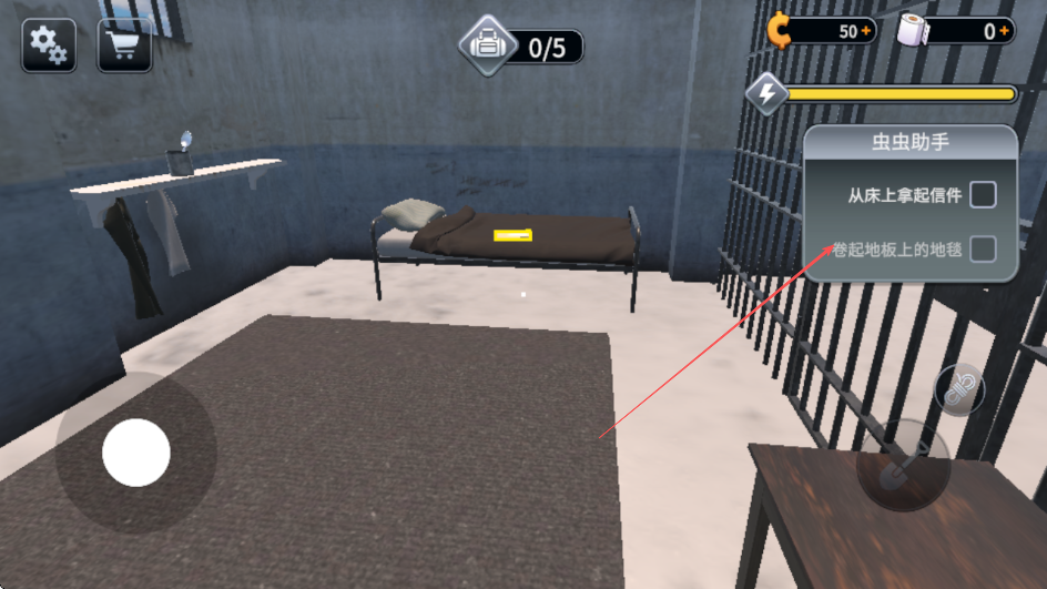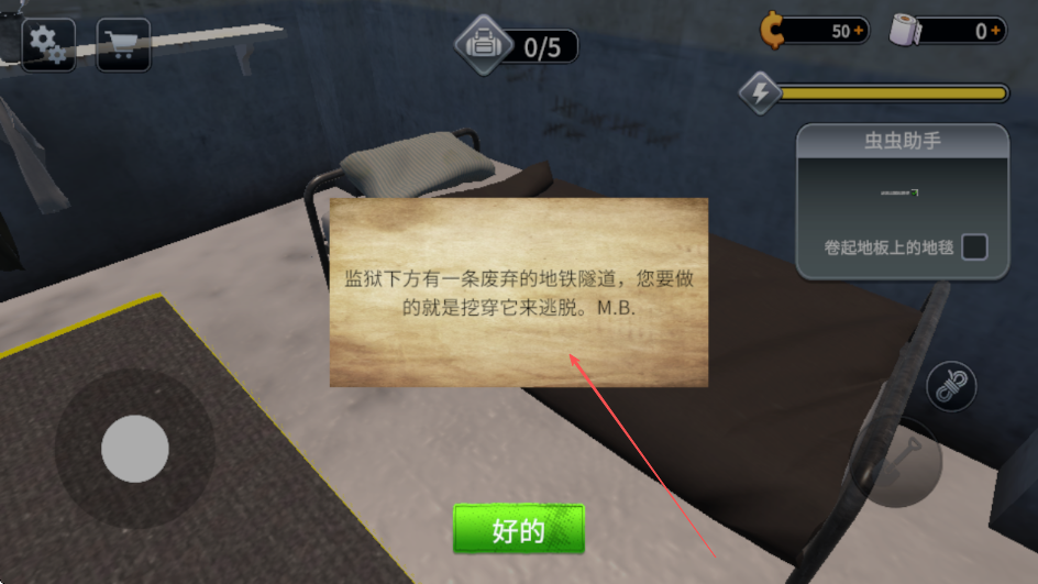 1、进入游戏界面观察牢房环境,看到提示,知晓任务包括从床上拿起信件和卷起地板上的地毯。