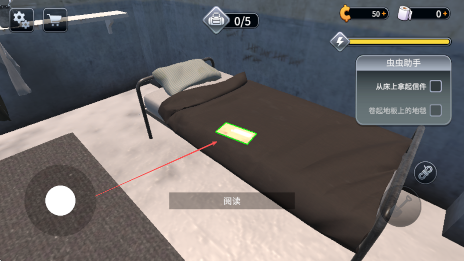 2、靠近床铺点击互动拿起床上信件,点击阅读了解信息,得知监狱下方有废弃地铁隧道可挖穿逃脱。