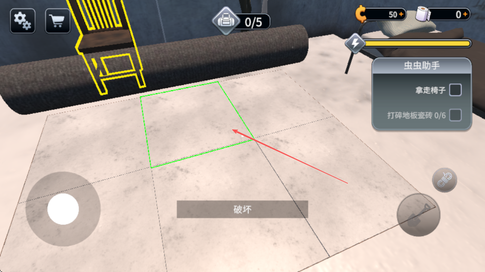 4、地毯卷起后,依据新提示拿走椅子打碎地板瓷砖0/6,点击互动拿走椅子,对地板瓷砖进行破坏。