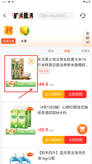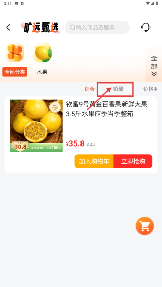 2、在水果商品列表页,点击销量选项,按销量排序商品。