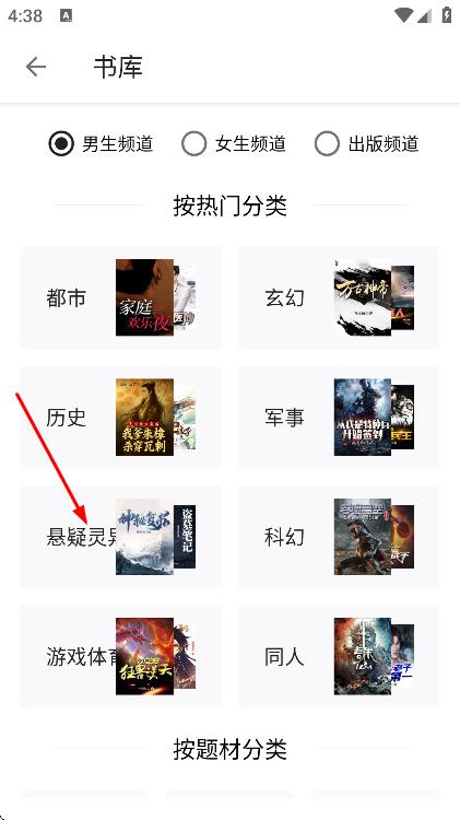 2、在书库页面,选择分类,进入悬疑灵异分类页面。