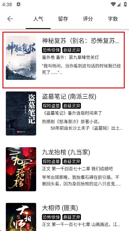 3、在悬疑灵异分类页面,选择小说,进入小说阅读页面。