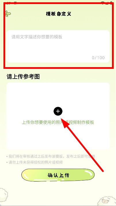 3、输入想要的模板描述,点击上传区域加号按钮,选择并上传参考图片。