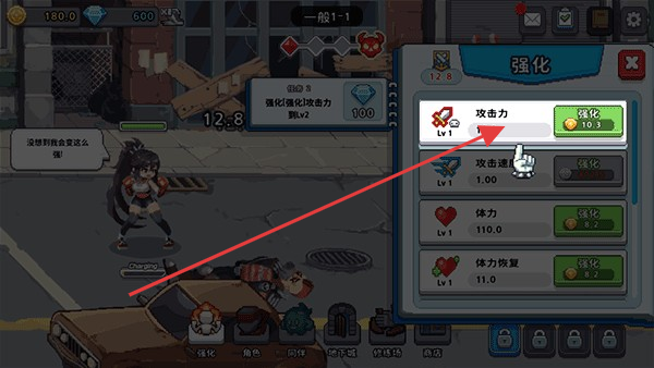 4、点击下方强化按钮,进入强化界面,选择攻击力等属性进行强化,提升角色战斗能力,消耗资源来增强角色属性。