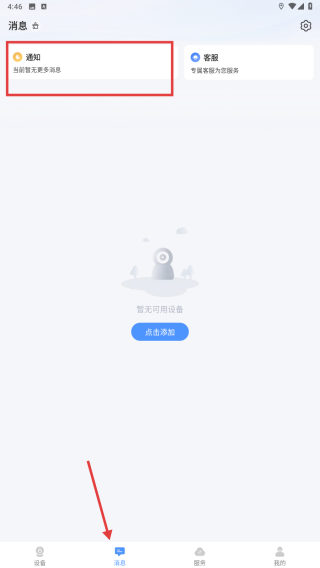 1、打开智能设备管理应用,在设备页面可查看设备相关设置,点击消息选项查看通知等信息。