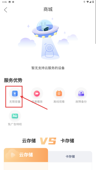 3、进入商城页面,了解无限容量、高速播放等服务优势,以及云存储和卡存储的对比。