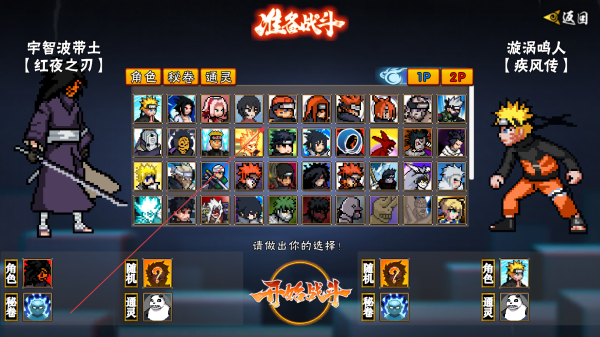 1、在准备战斗界面,从众多火影角色中选择心仪角色,比如宇智波带土红夜之刃,还能搭配秘卷和通灵兽,点击开始战斗进入对战。