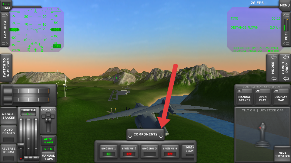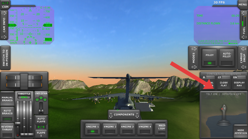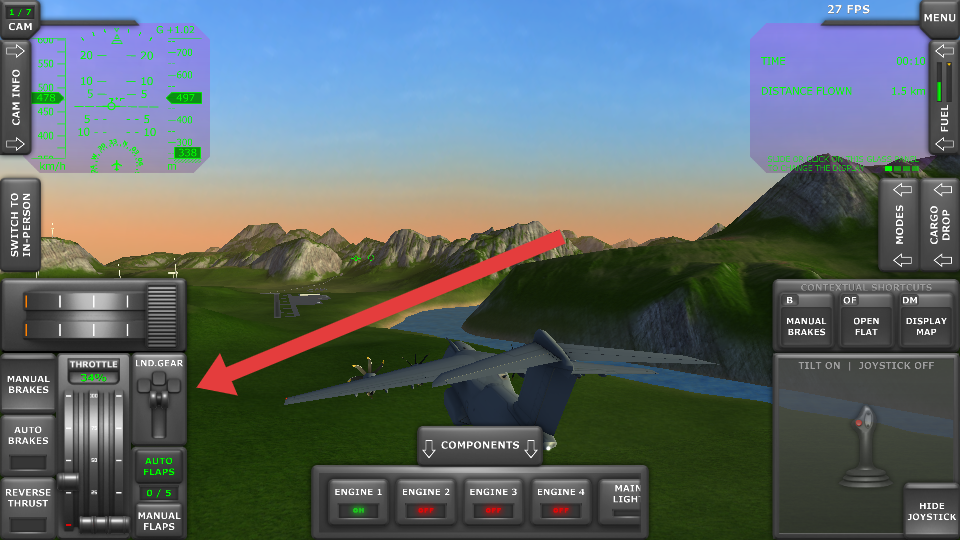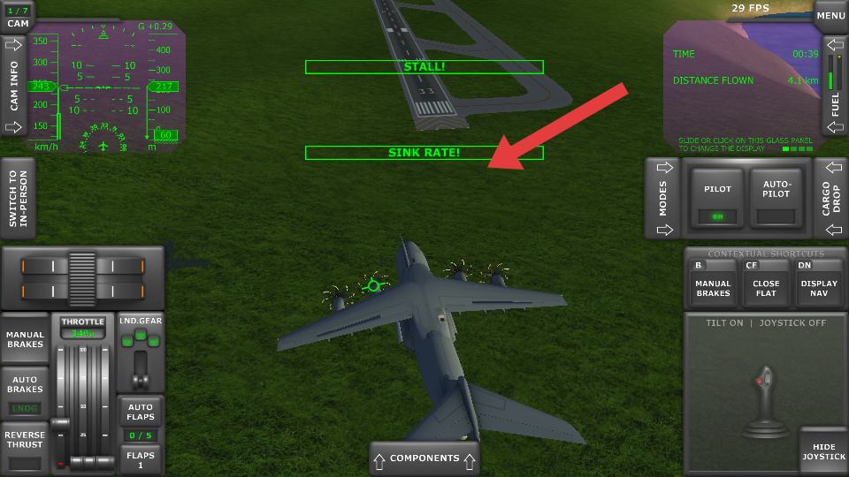 3、当界面出现降落相关提示,准备降落对准跑道标识时,立即降低油门减小飞行速度,通过仪表盘观察高度变化。