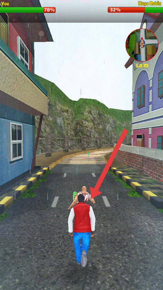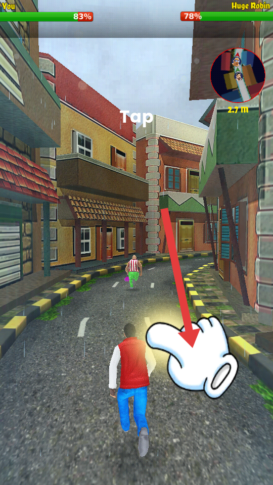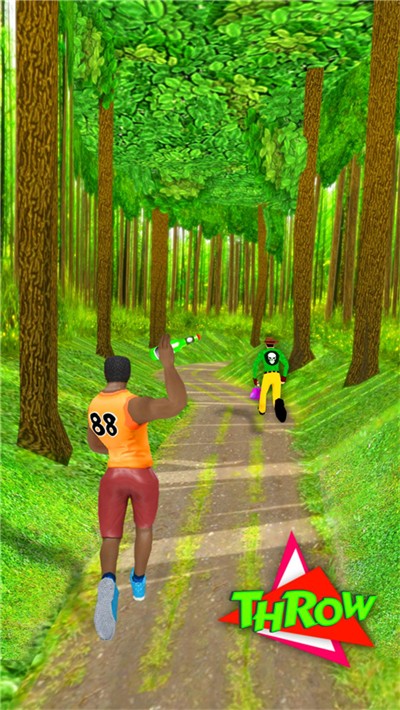 3、道具使用与目标达成:在跑酷途中捡起酒瓶子等物品,瞄准强盗扔出进行打击,通过持续追逐缩小距离,成功抓捕强盗可完成任务获得胜利。