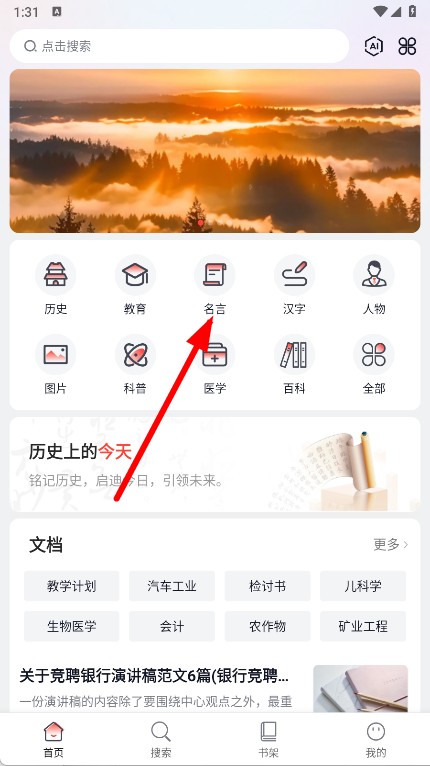 1、打开知识贝壳,在首页功能区点击名言选项,进入名言分类页面。