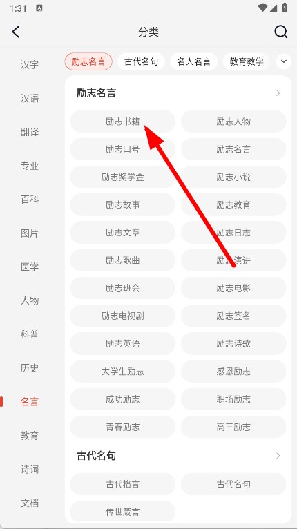 2、在名言分类页面,点击励志书籍标签,进入励志书籍相关内容列表。