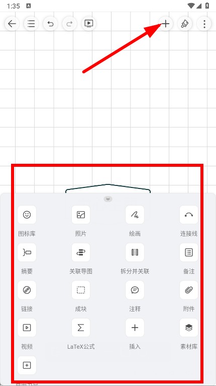 3、点击顶部的+按钮添加节点、插入各类内容,构建思维导图的结构与内容。