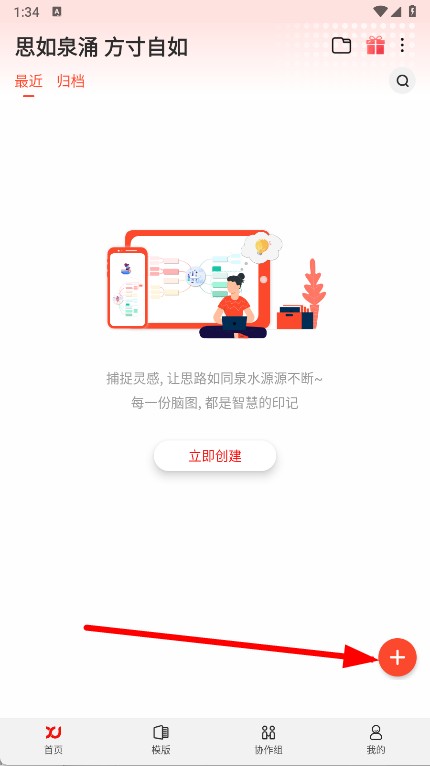 1、打开寻简思维导图,点击页面右下角的红色+按钮,进入创建类型选择界面。