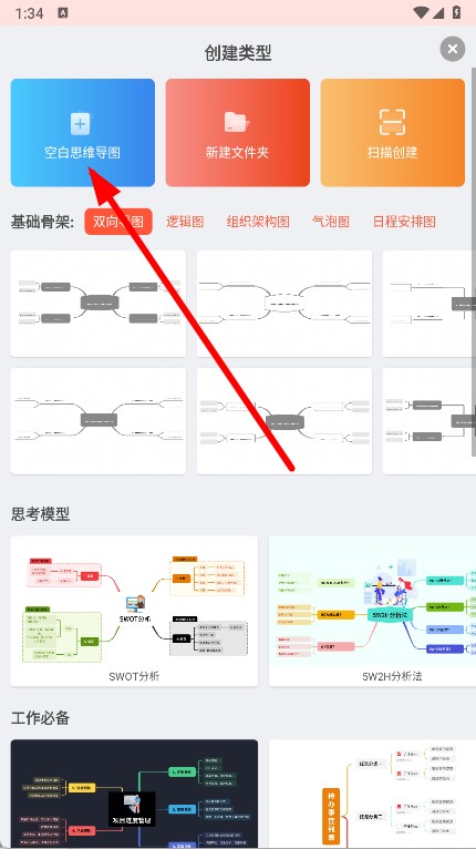 2、在创建类型界面中,选择空白思维导图选项,进入思维导图编辑页面。