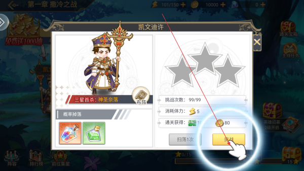 2、点击关卡中的敌人角色,如凯文迪许,查看挑战信息,确认消耗体力和通关获得的奖励后,点击挑战按钮开启战斗。