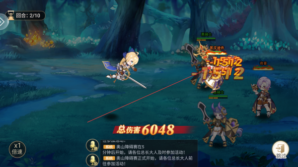 3、战斗过程中,观察屏幕下方的伤害数值和总伤害数据,了解己方英雄输出情况,适时点击倍速或跳过按钮,加快战斗进程。
