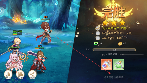 4、战斗结束后,查看战斗评价和掉落奖励,点击任意位置继续游戏,利用获得的资源培养英雄,挑战后续关卡。