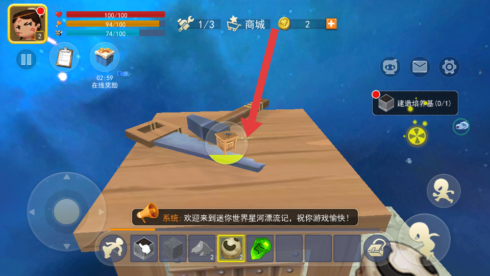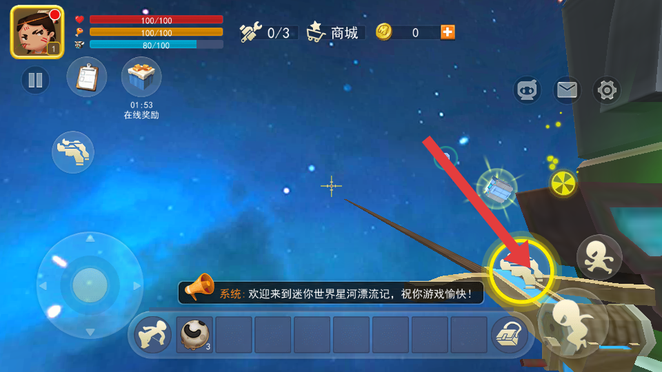 3、创造模式操作与自由建造:进入创造模式后,用方向控制器操控角色移动,拖动右侧屏幕调整视角;点击“喷射塞子”吸引太空漂浮物,创造模式下资源无限制。