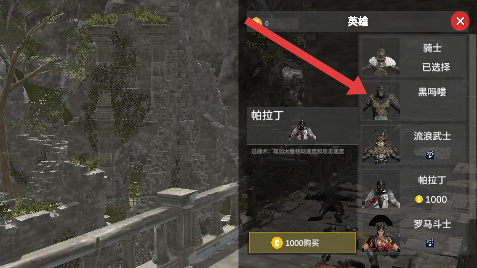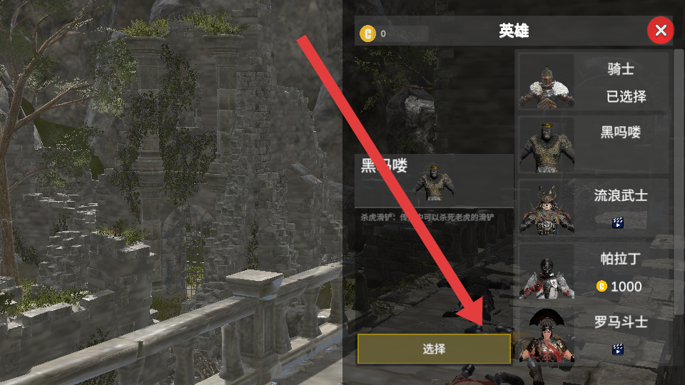 1、先点击主界面英雄图标,在英雄列表中可看到骑士、黑吗喽、流浪武士、帕拉丁、罗马斗士等角色,点击英雄可查看其技能。