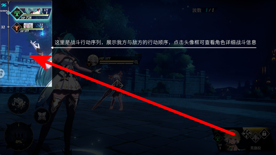 2、接着了解战斗行动序列,界面会展示我方与敌方的行动顺序,点击角色头像框,可查看角色详细战斗信息,这有助于玩家制定战斗策略。