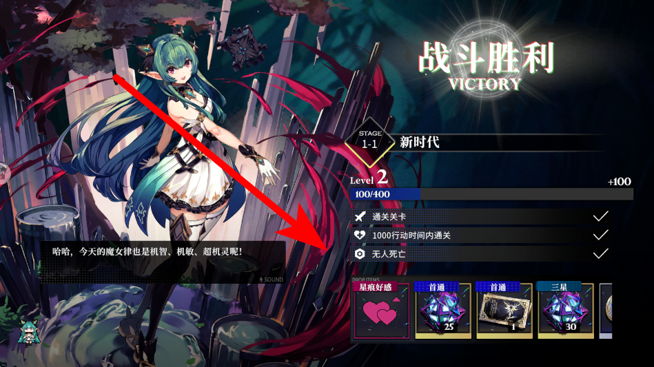 4、最后达成战斗胜利,显示战斗胜利,同时能看到通关关卡、通关时间、是否有人死亡等信息,还可获得星航好感、首通奖励等各类奖励。