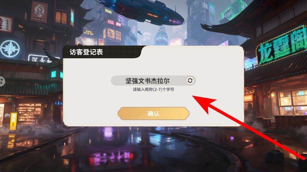 1、首先进行角色创建昵称设定,找到输入昵称的区域,按照提示输入2到7个字符的昵称,然后点击确认按钮,完成昵称设定,开启游戏旅程。