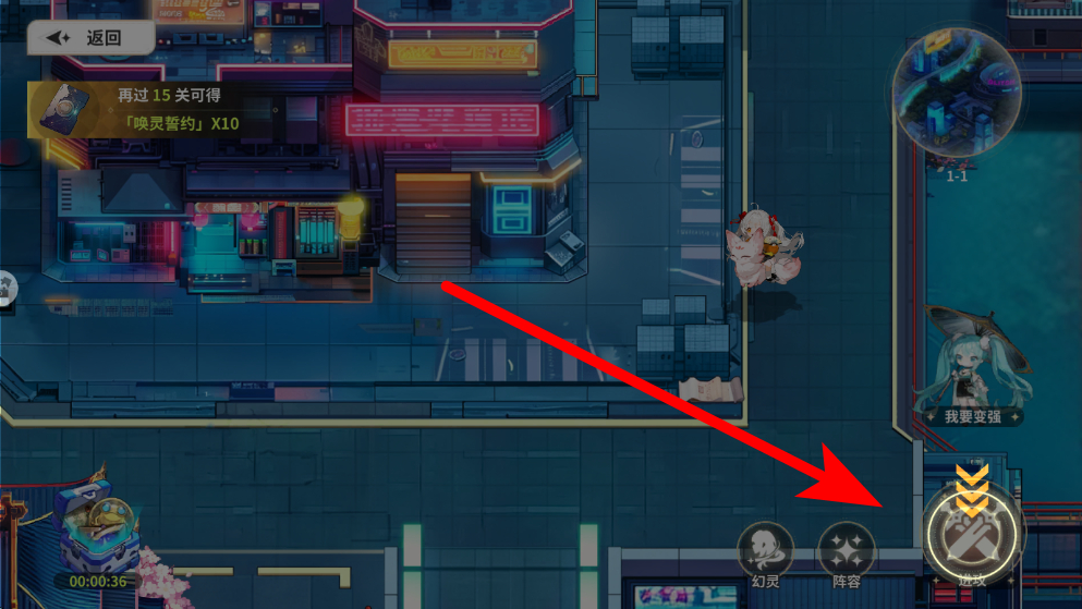 2、能看到场景内的建筑与进攻提示,界面下方有幻灵阵容进攻等功能图标,点击这些图标可查看或调整幻灵、阵容等战斗相关设置,为战斗做准备。