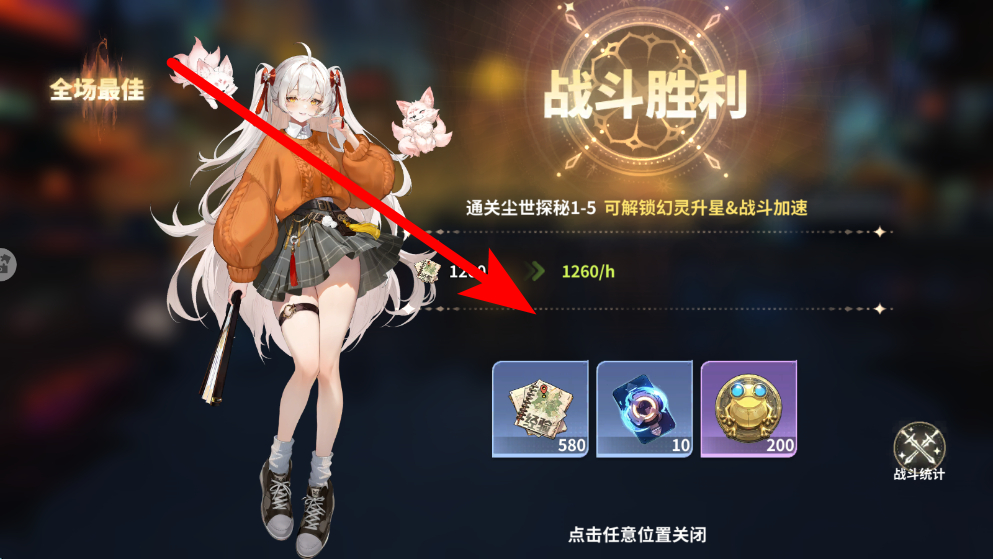 4、最后获取胜利奖励,战斗胜利后,会显示战斗胜利界面,同时能获得各类奖励,如特定数量的道具等,点击任意位置可关闭该界面,继续后续内容。