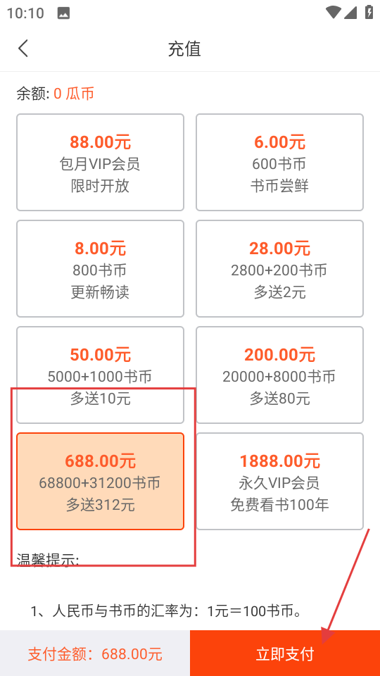 4、在充值页面,选择充值金额,再点击立即支付完成支付。