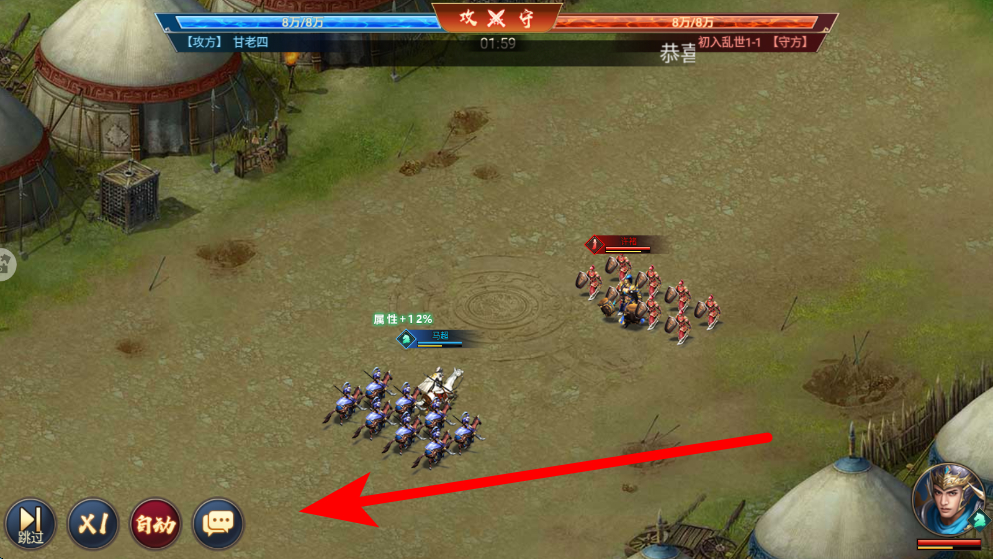 1、首先参与攻防战斗,可看到攻方与守方的兵力等信息,界面下方有跳过自动等功能按钮,根据战斗情况,选择合适的功能,指挥部队与敌方展开交锋。