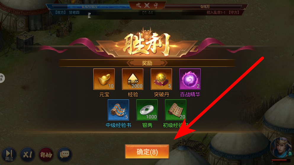 2、接着领取胜利奖励,战斗胜利后,会弹出胜利界面,展示元宝、经验、突破丹等各类奖励,点击确定按钮,即可领取这些奖励,助力角色与部队成长。