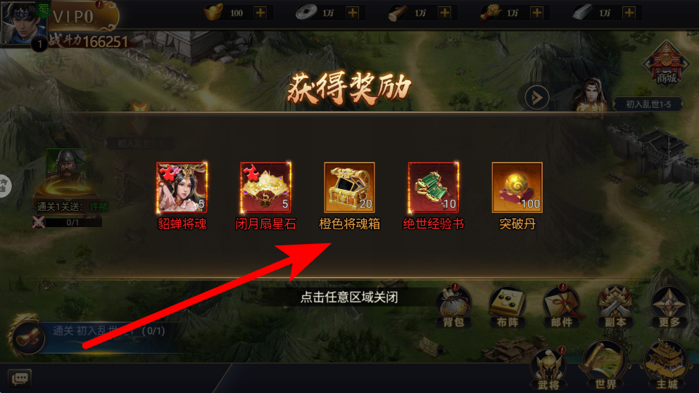 4、完成特定任务或关卡后,会获得获得奖励界面,展示貂蝉将魂、闭月扇星石、橙色将魂箱等珍稀奖励,点击任意区域可关闭该界面,这些奖励能极大提升战力。